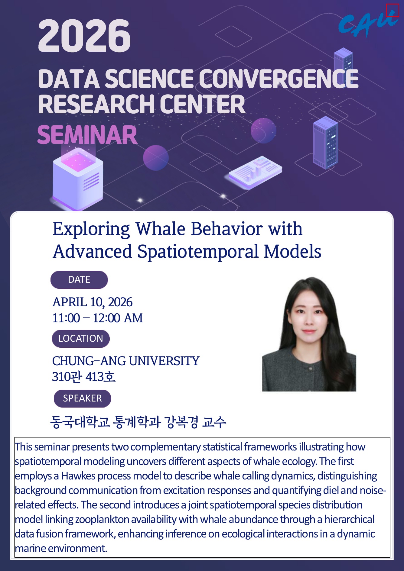 중앙대학교 데이터사이언스융합연구소에서 2026년 4월 10일 Seminar를 개최합니다.